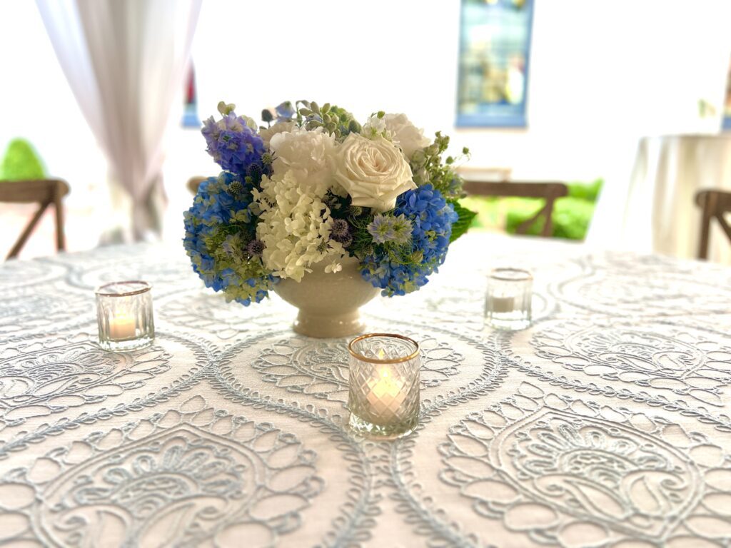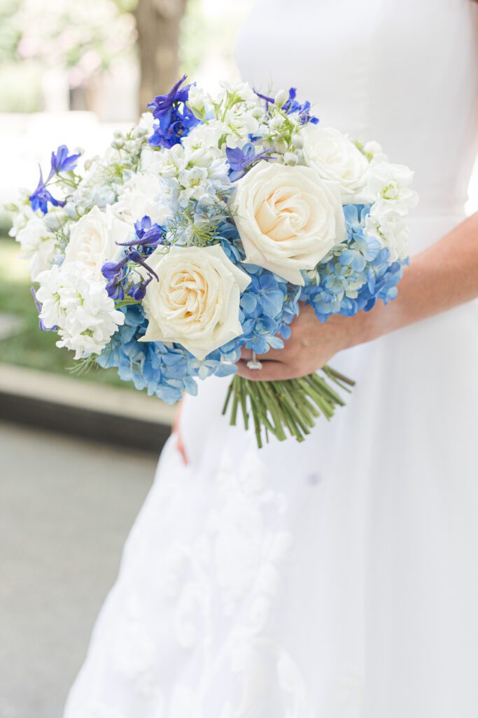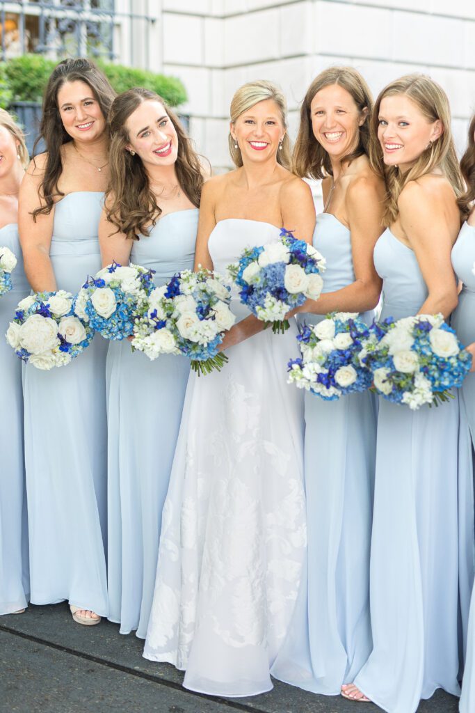 The bridal party carried classic, but sophisticated round bouquets in blue and white, using hydrangea, roses and delphinium. The bouquets were designed to pop from the bridesmaid’s pale blue dresses.