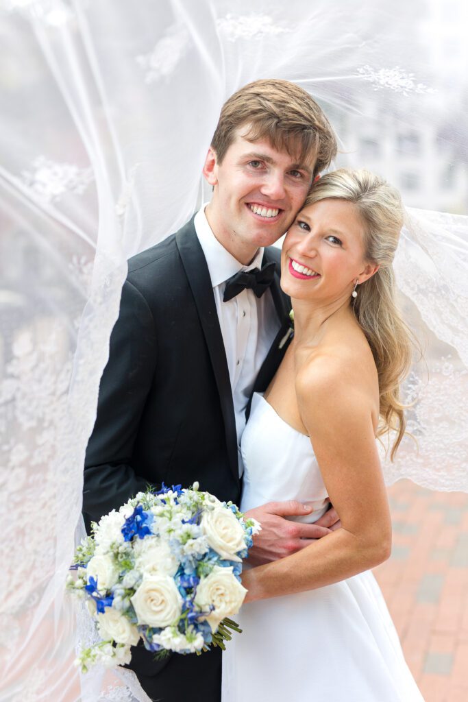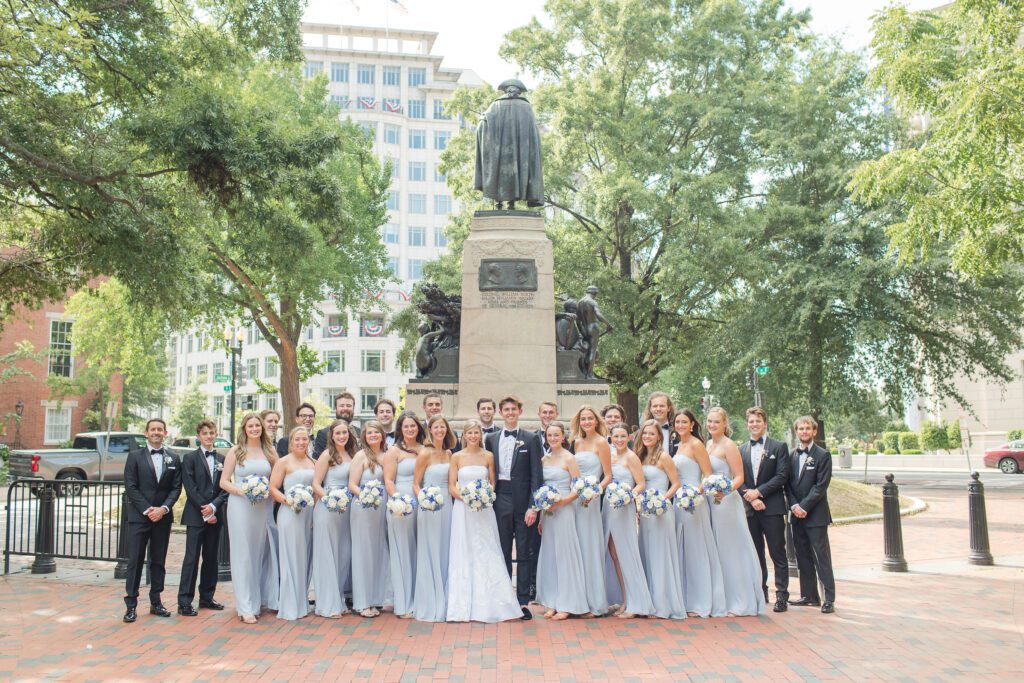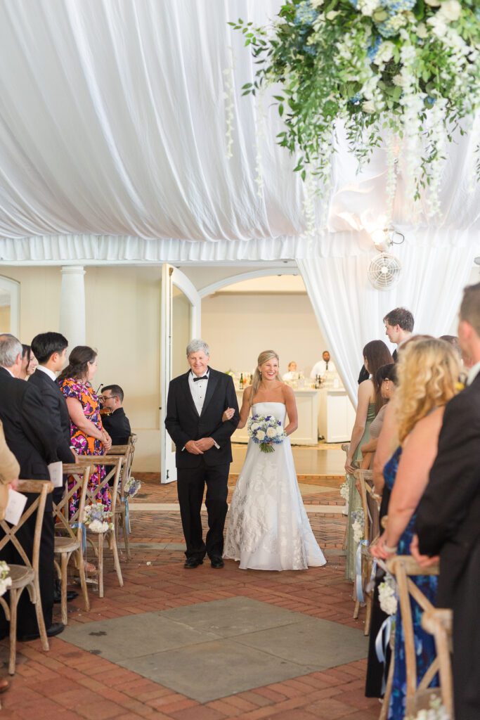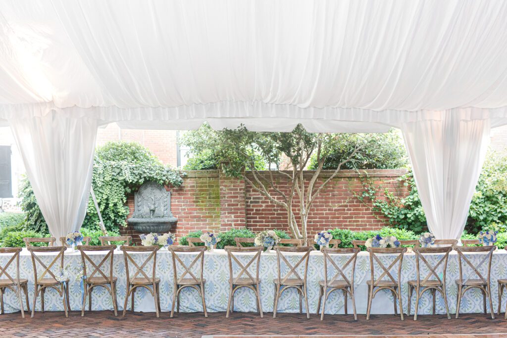 Obviously the pièce de résistance of this wedding was the two chandeliers hanging over the dance floor. This classic, blue and white hydrangea wedding at Decatur House was a dream come true for a floral designer wanting to stretch her wings. Emily had a vision of walking down the aisle under the chandeliers, with the ceremony space eventually turning into the dance floor.