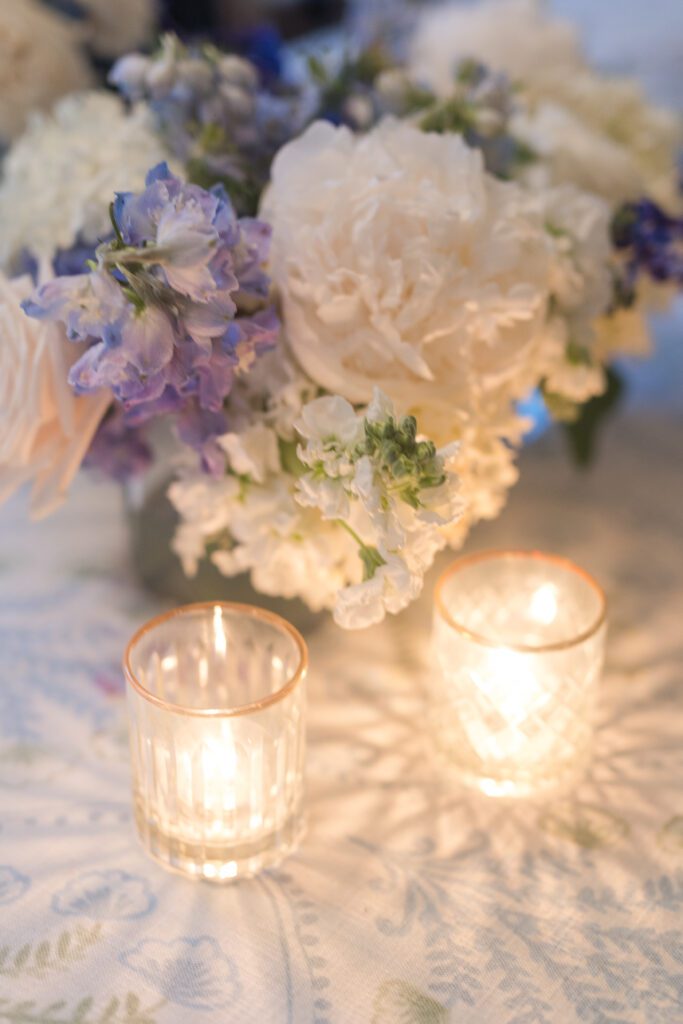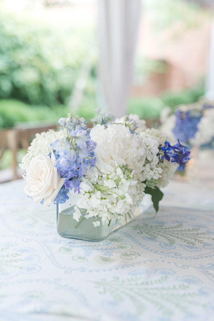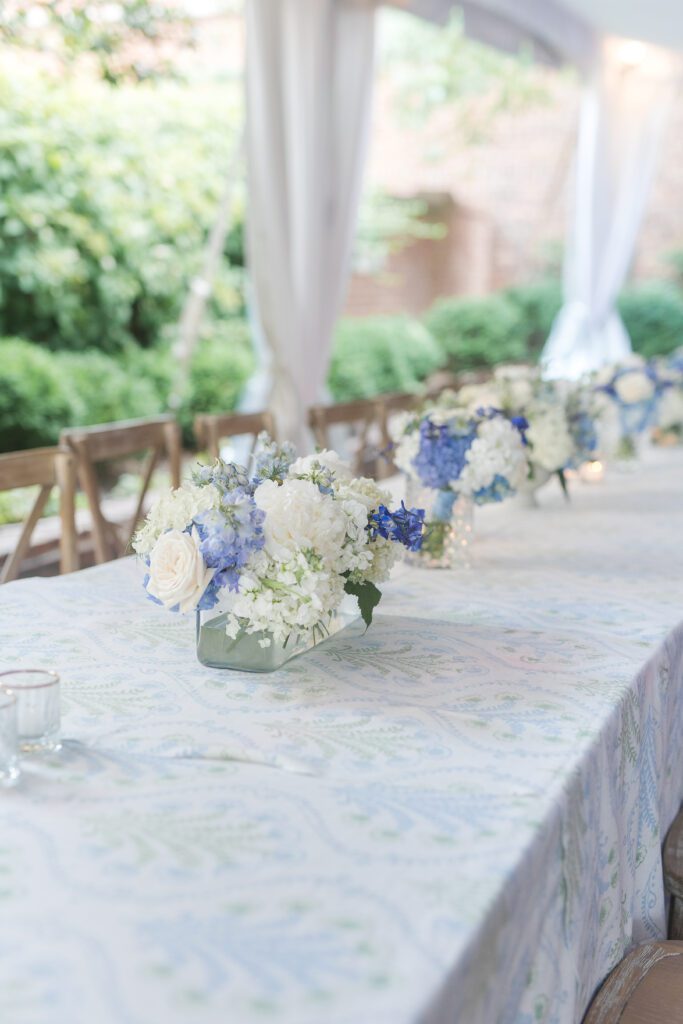 The tables were dressed with sweet blue and white floral print linens. The long tables were decorated with long and low arrangements of hydrangeas, roses and delphinium, combined with clear votives and vases to hold the bouquets.