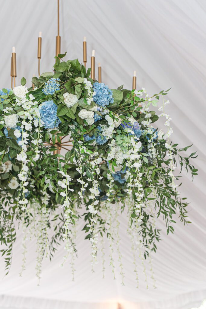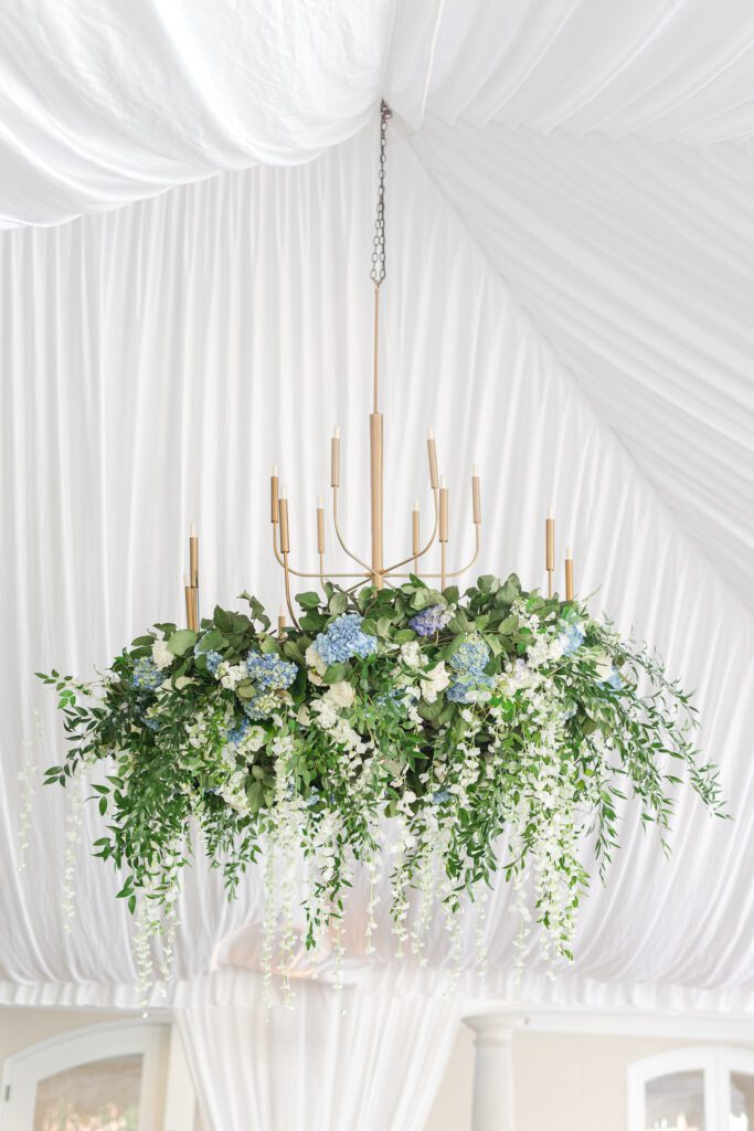 Last but not least, the chandelier. These were assembled mostly onsite on 12ft ladders! One thing I have added to my inventory over the years is a few types of quality silk flowers. One reason is that certain flowers don’t hold up well in an installation, and the second is that hydrangeas, in particular, are not available (to me) all year round, due to my use of American Grown Flowers. I’ve learned that silk hydrangeas work great for large installations, when paired with fresh florals and greens. That’s exactly what we did here. We used a base of fresh greenery, inserted silk hydrangeas and wisteria, and added fresh hanging greens, and roses.